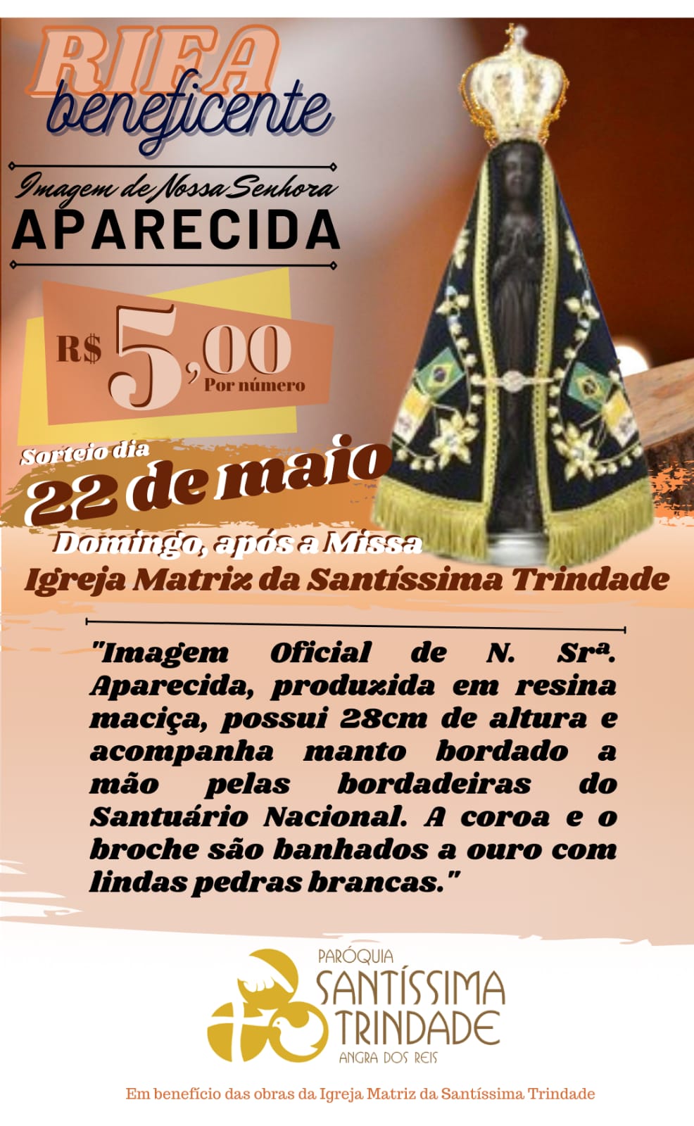 Rifa Beneficente – Imagem de Nossa Senhora Aparecida – Sorteio 22 MAIO 2022 – Matriz